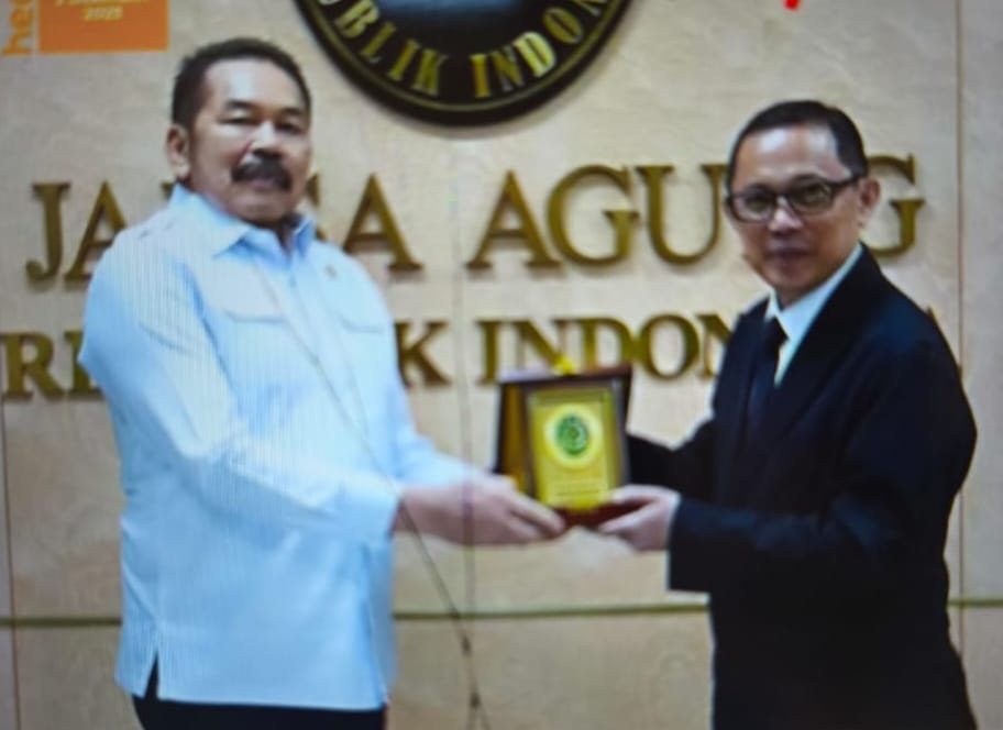 Caption : Rektor Unsrat Prov DR Ir Oktavian B.A Sompie M.Eng.IPU ASEAN Eng saat menerima cendera mata dari Jaksa Agung RI Dr ST Burhanudin SH MH saat kunjungan di Kantor Kejaksaan Agung RI di Jakarta