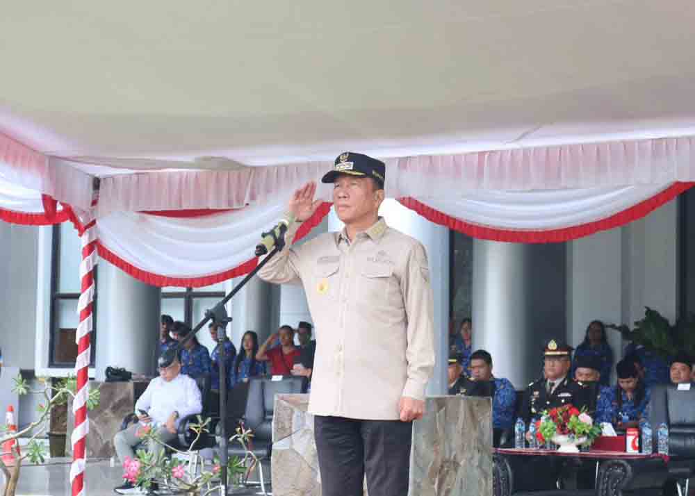 CAPTION : Bupati Minsel Frangky D Wongkar SH, menjadi inspektur upacara pada peringatan hari Bela Negara ke -77 Tahun 2025 di Kabupaten Minahasa Selatan.